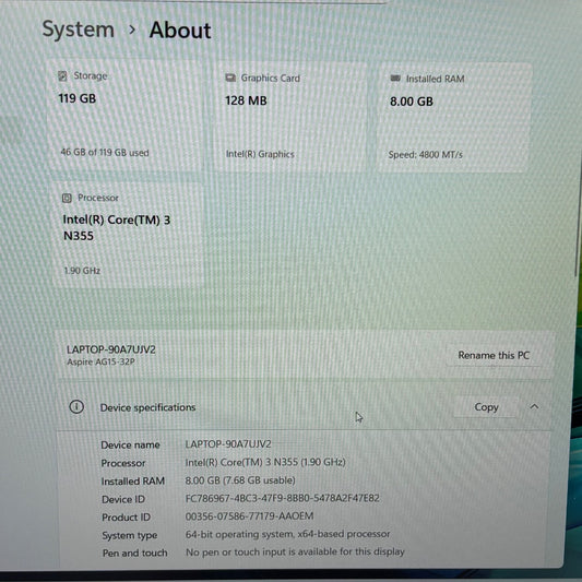 Acer Aspire Go 15 AG15-32P 15.6" 3 N355 1.9GHz 8GB RAM 128GB SSD